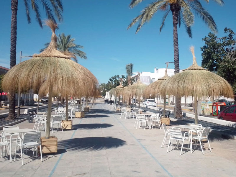 Fabricación e instalación de conjunto sombrilla carritx en flecos 220 cm diámetro instaladas mediante base móvil. UBICACIÓN: La Carlota, Córdoba PRODUCTO: Sombrillas de Carritx