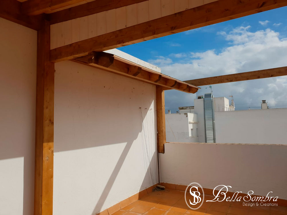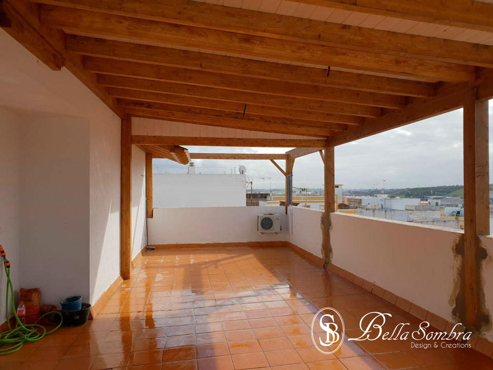 Trabajo realizado en Chiclana de la Frontera, Cádiz. Cerramiento de ático para vivienda formada por estructura de madera, forrado de cubierta en duelas, aislamiento térmico e impermeabilización.