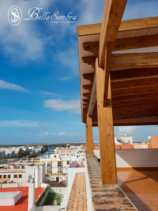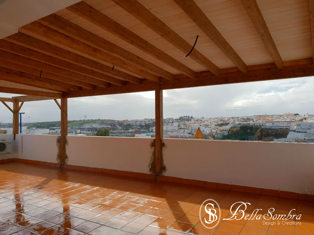 Trabajo realizado en Chiclana de la Frontera, Cádiz. Cerramiento de ático para vivienda formada por estructura de madera, forrado de cubierta en duelas, aislamiento térmico e impermeabilización.