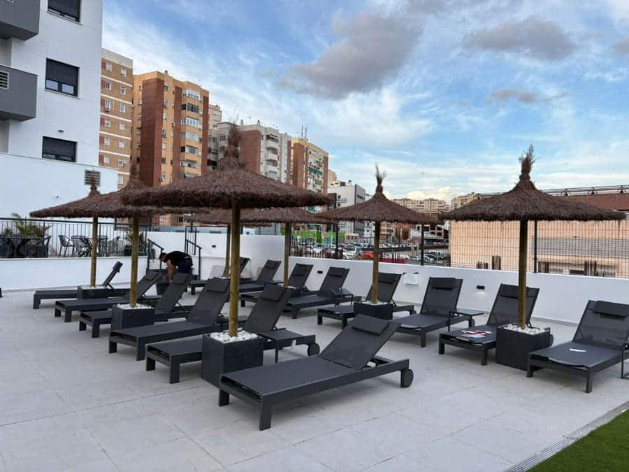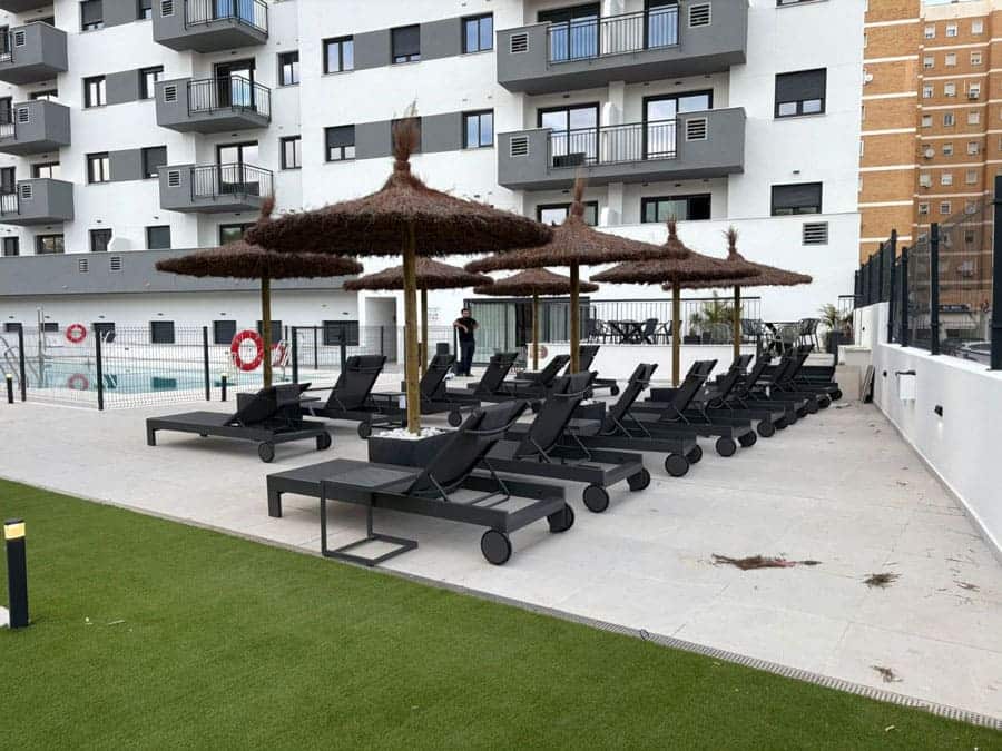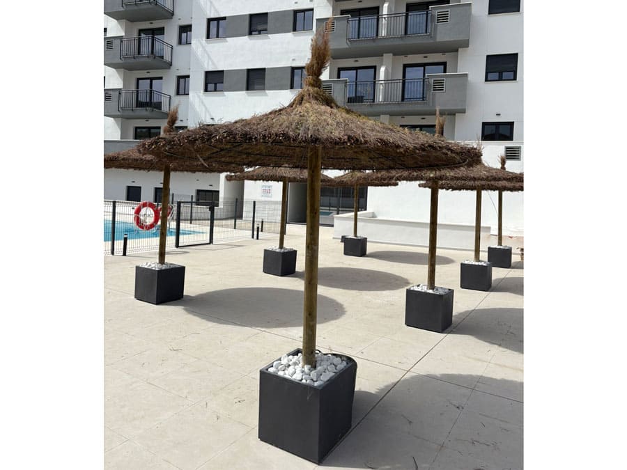 Sombrilla de brezo en Cala de Mijas, Málaga. Sombrillas de brezo 240 cm diámetro, instaladas mediante base de poliéster en comunidad de vecinos.