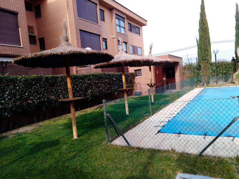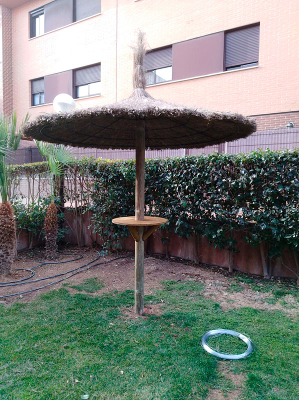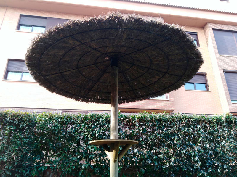 Conjunto de sombrillas de brezo de medida 2’40m diámetro con mesita incluida, suministro e instalación en Ciudad Real, Castilla-La Mancha.